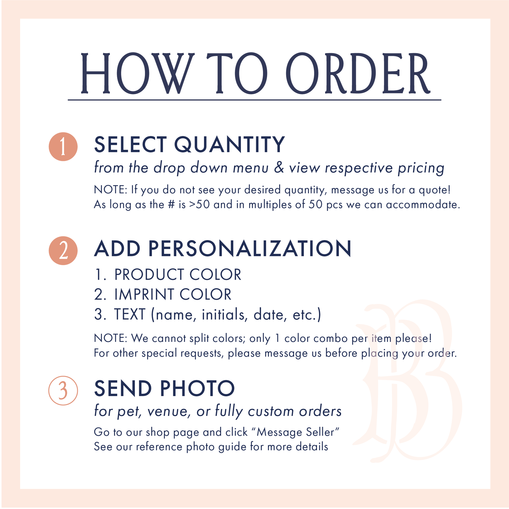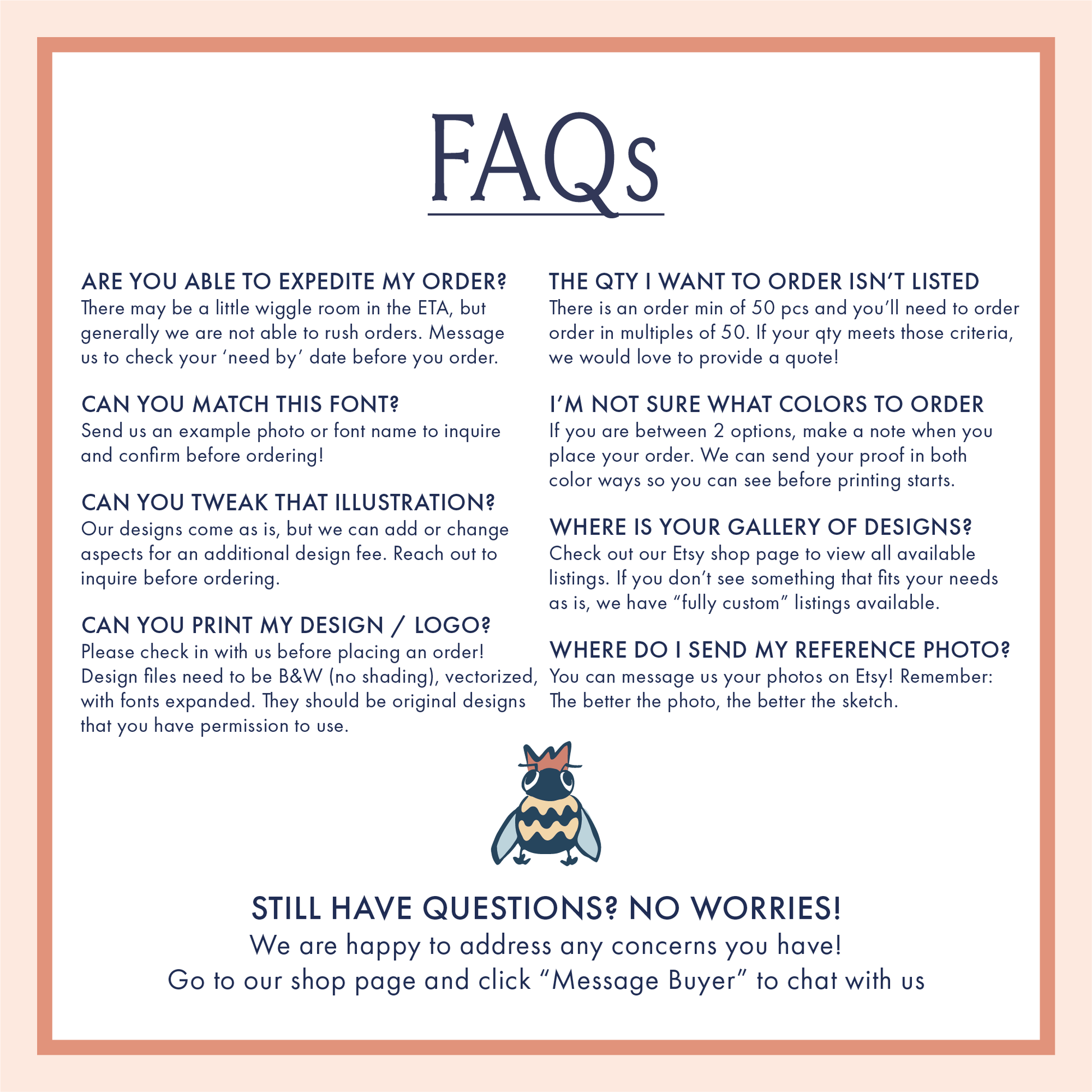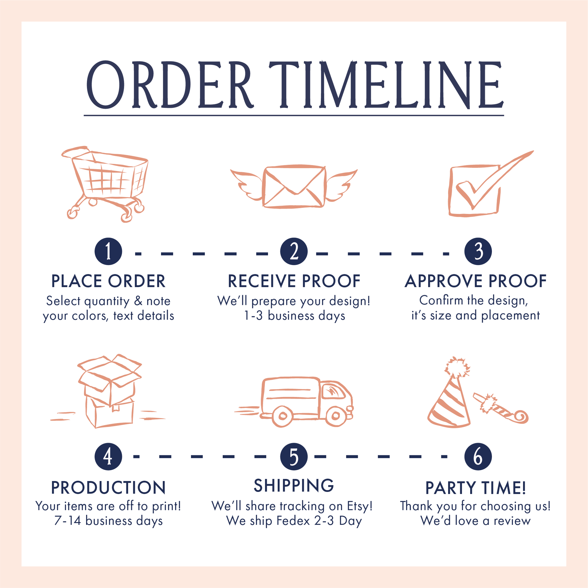 Once we receive your complete order details, we will prepare a design proof within 3 business days. Orders will be sent to production after this proof is approved by you! Please reach out if you have additional questions!
