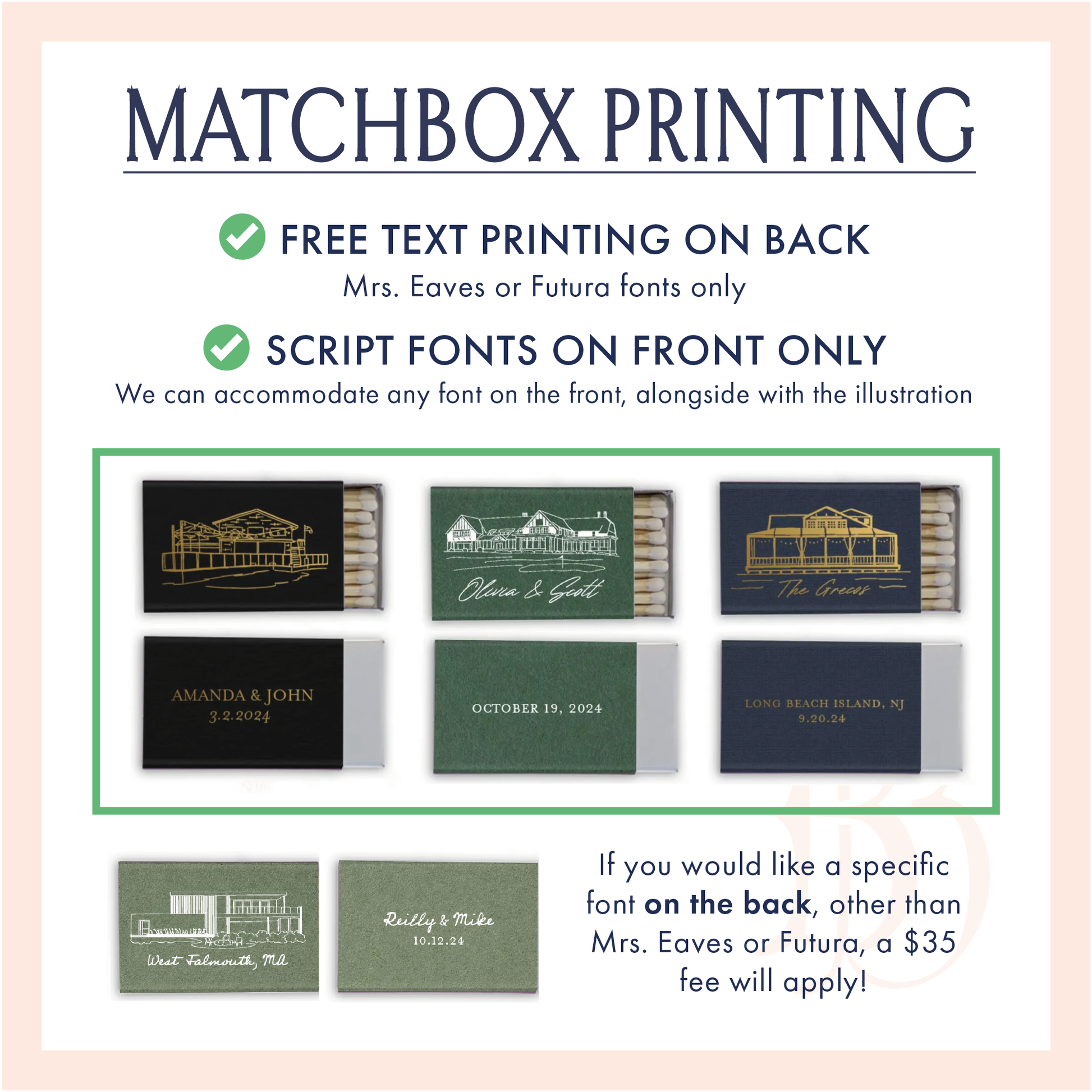 Free shipping on orders over $35, always! Please note the order minimum for custom orders is 50 matchboxes, and the turnaround time is ~3 weeks from purchase.