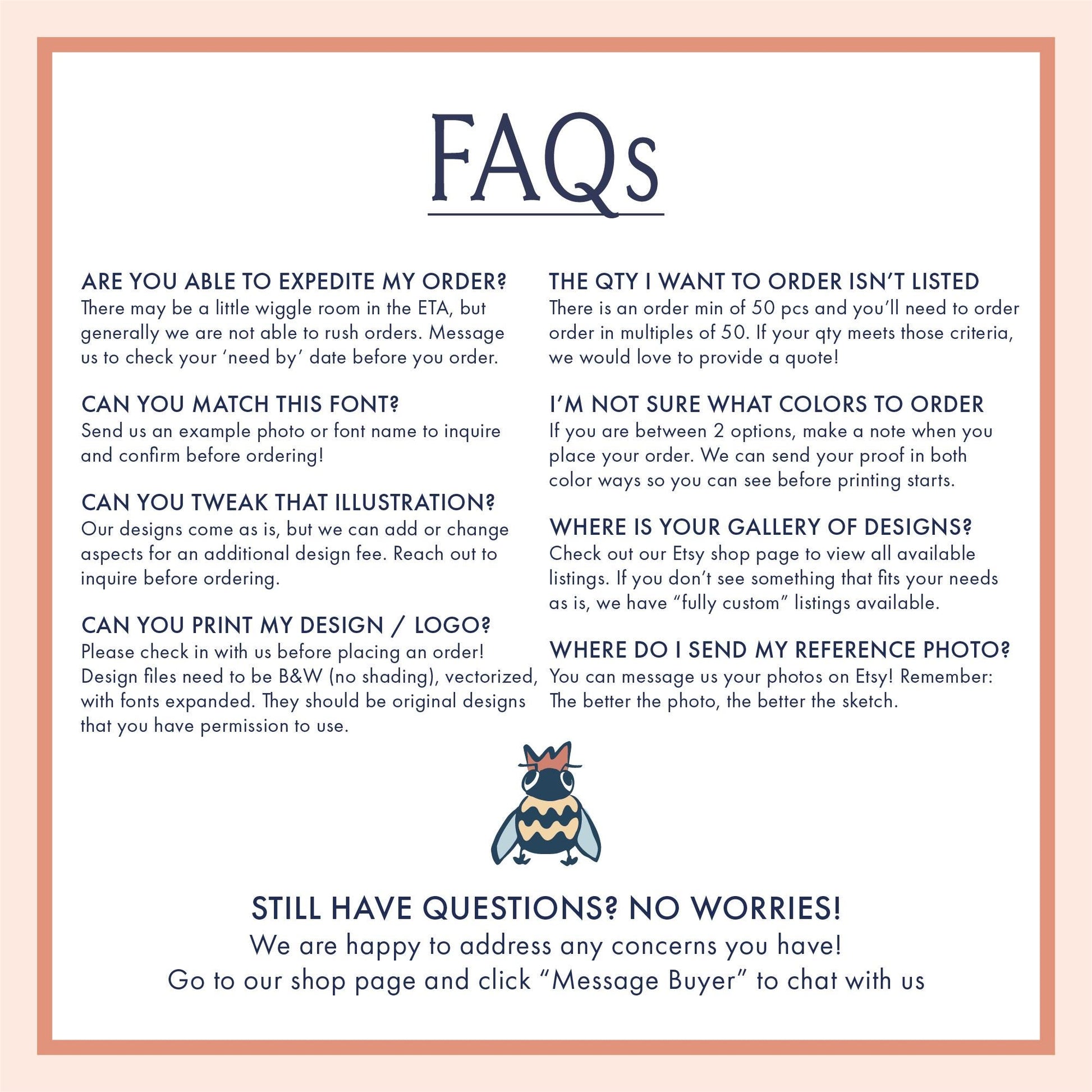 Once we receive your complete order details, we will prepare a design proof within 3 business days. Orders will be sent to production after this proof is approved by you! Please reach out if you have additional questions!
